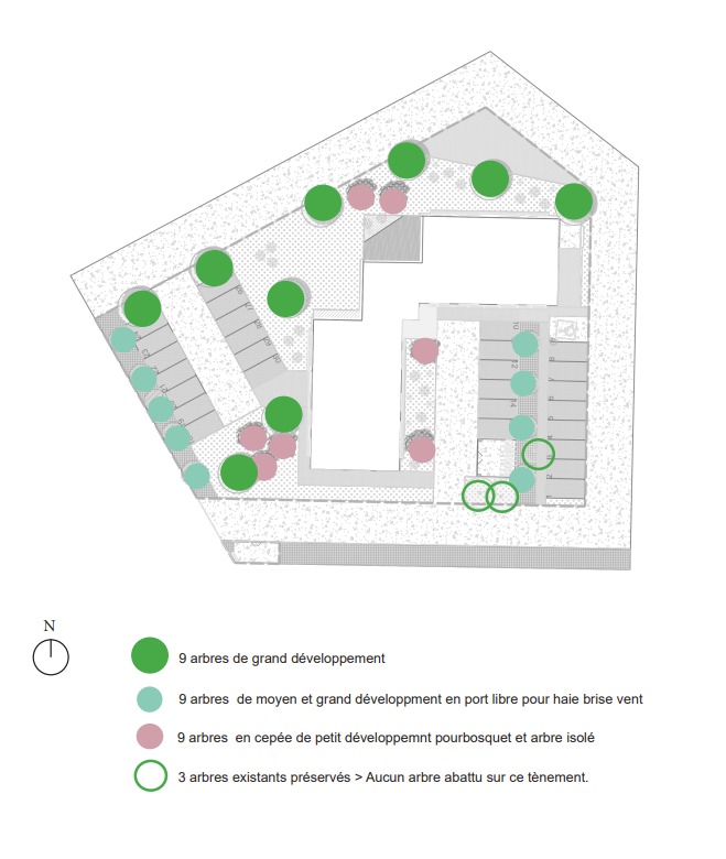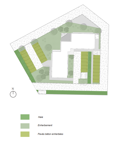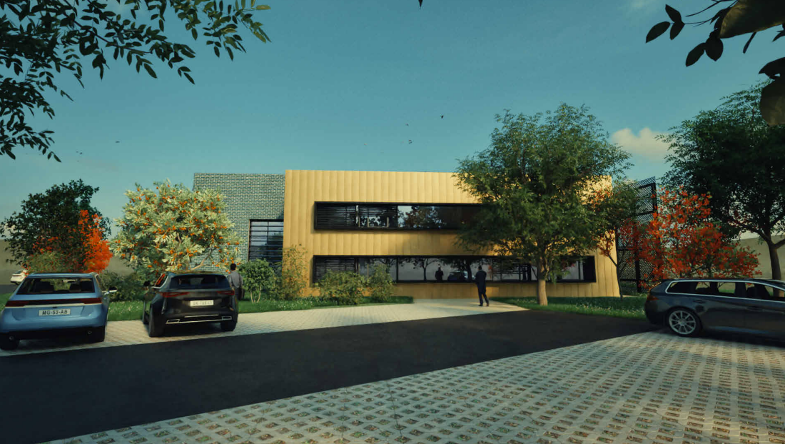 Le projet USHUAIA, situé au Parc Industriel de la Plaine de l’Ain à Blyes, vise la restructuration complète d’un bâtiment tertiaire et la requalification de ses espaces extérieurs. L’aménagement paysager met l’accent sur la biodiversité et le confort d’usage grâce à la création de haies brise-vent bocagères et de bosquets arborés valorisant les abords du site. Les cheminements piétons et parkings sont entièrement perméables, favorisant l’infiltration naturelle des eaux pluviales via noues végétalisées et chaussées à structure réservoir. Une terrasse plantée et un mur végétalisé renforcent le lien intérieur/extérieur du bâtiment, tandis qu’un local à vélos et des bornes de recharge encouragent les mobilités douces. Les espaces verts sont conçus pour un entretien raisonné et une gestion économe de l’eau, avec récupération des eaux pluviales pour l’arrosage. L’éclairage, les clôtures et portails ont été repensés pour garantir sécurité, accessibilité et cohérence esthétique. L’ensemble compose un cadre de travail durable, apaisé et exemplaire sur le plan environnemental.