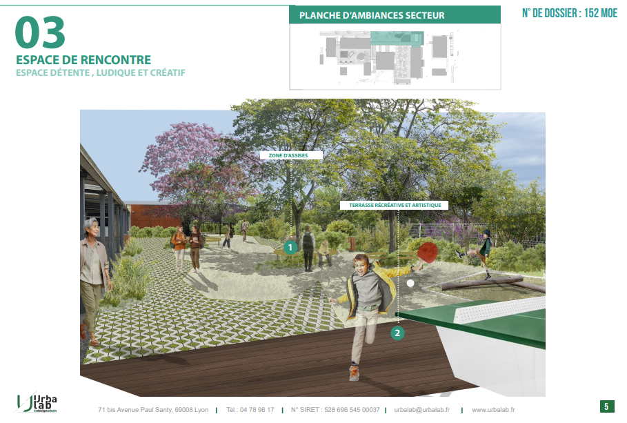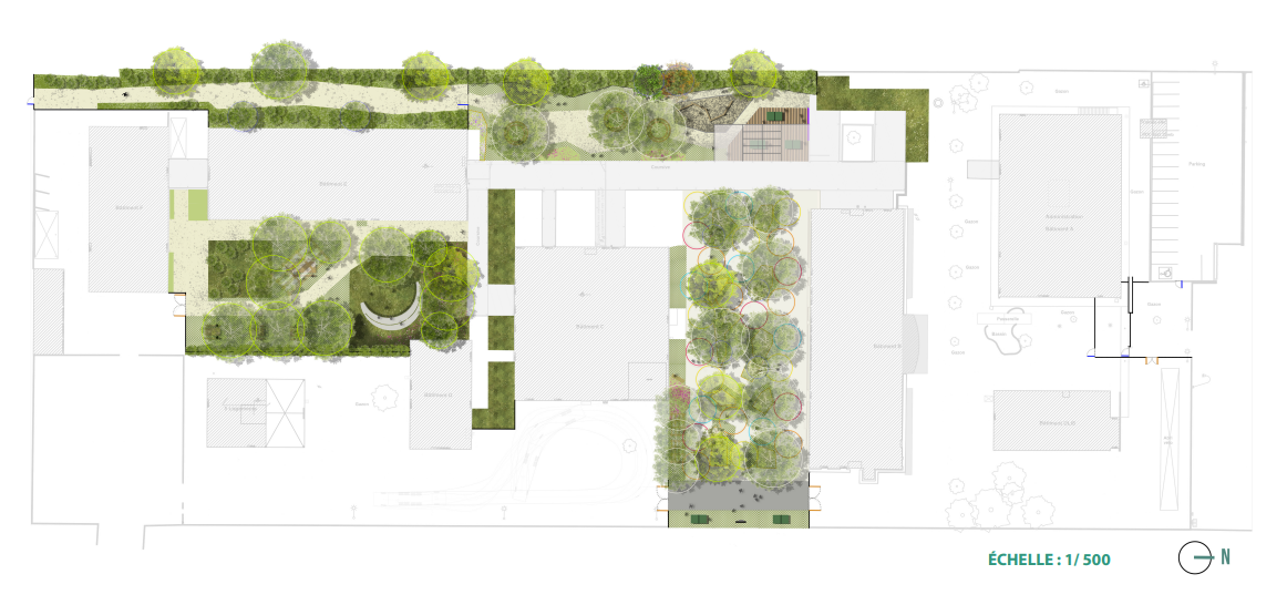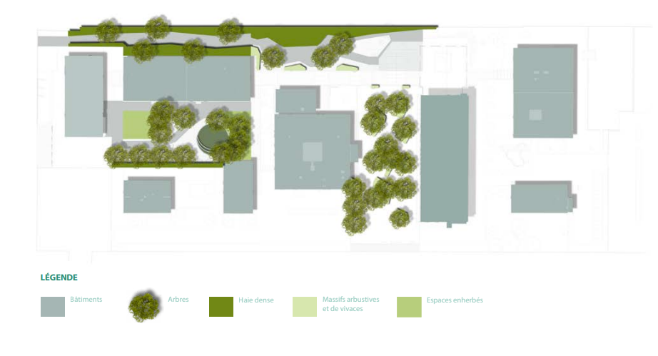 Le volet paysager et aménagements extérieurs, conçu par URBALAB, transforme les 5 300 m² d’espaces extérieurs en milieux fonctionnels et qualitatifs :
