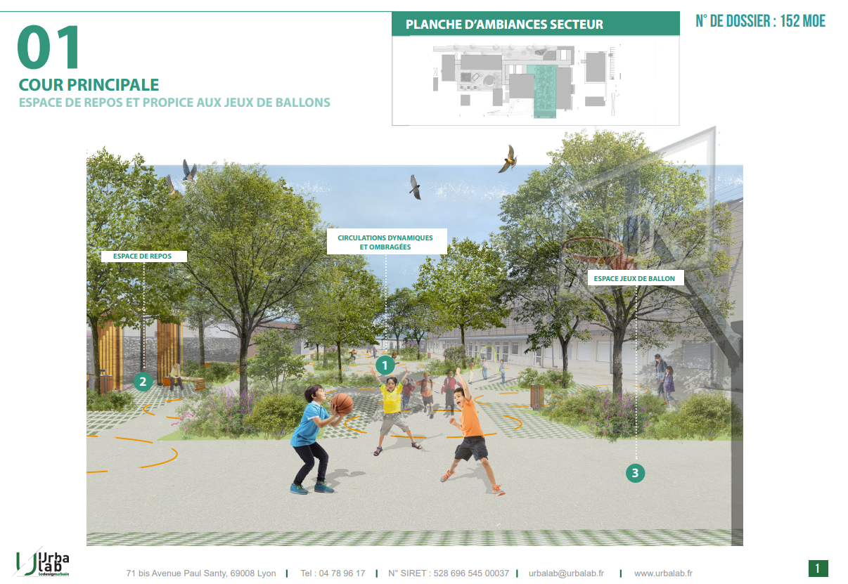 L’intervention met l’accent sur la désimperméabilisation des sols (74 % des surfaces concernées), la végétalisation, la gestion des eaux pluviales à la parcelle et la réduction des îlots de chaleur.